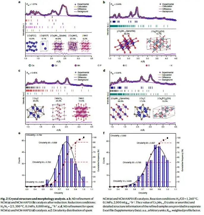 图2c-d为反应后(spent)样品的ND精修。NCM(图2c)中Co₂C占60.6%,MnCO₃占25.4%,立方MnO占14.0%。而NCM-HAP15(图2d)中Co₂C仅占17.0%,三斜相Co-Mn氧化物仍占69.8%,表明羟基促进剂抑制了碳化反应,保持了氧化物的主导地位。补充图14c显示,随着HAP含量增加,三斜相氧化物相比例升高,Co₂C比例下降,而烯烃选择性先升后降。这说明适量的Co₂C对C–C偶联至关重要,但过多则导致过度加氢和石蜡生成。因此,羟基促进剂实现了“氧化物主导活化、碳化物辅助偶联”的最佳平衡。