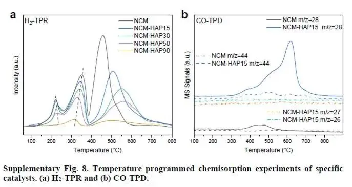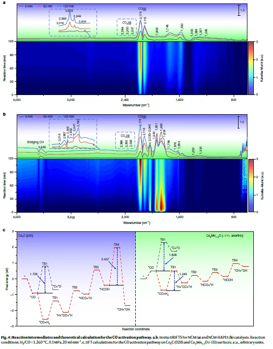 解析:图4a-b为NCM和NCM-HAP15在260 °C、H₂/CO=1条件下的原位DRIFTS谱。