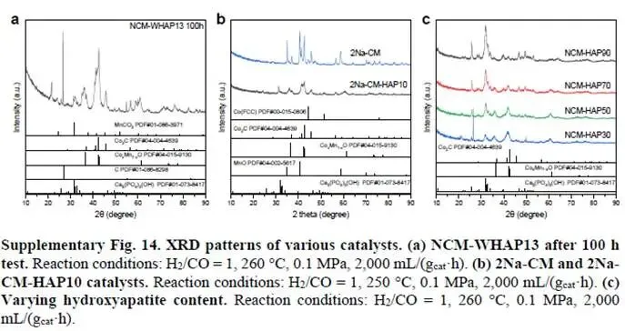 - 催化剂结构:羟基促进剂诱导Co-Mn氧化物从高对称立方相转变为低对称三斜相,抑制了氧化物的过度还原和碳化,稳定了三斜相Co-Mn氧化物作为主要活性相,同时生成适量Co₂C负责C–C偶联。