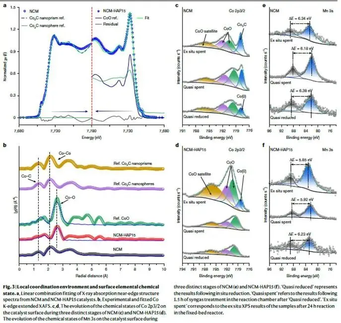 解析:图3a为反应后NCM和NCM-HAP15的Co K边XANES线性组合拟合。通过与标准样品(Co₂C纳米棱柱、Co₂C纳米球、CoO、Co箔)拟合,NCM的光谱与Co₂C纳米棱柱高度吻合;而NCM-HAP15则表现为Co₂C纳米球(51.5%)和CoO(47.4%)的混合物。这说明羟基促进剂不仅抑制了碳化程度,还改变了Co₂C的形貌(从棱柱变为球形)。棱柱状Co₂C被认为有利于烯烃生成,但本研究中NCM-HAP15的烯烃选择性并未下降,意味着烯烃生成的主要贡献可能来自氧化物–碳化物界面而非Co₂C本身的晶面效应。