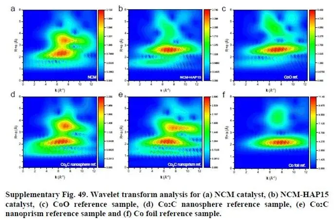 图3b为Co K边EXAFS谱及拟合。NCM在1.35、2.14和2.62 Å处出现Co–C、Co–Co和Co–O散射峰,与Co₂C一致。NCM-HAP15则主要呈现Co–O特征(~2.62 Å),接近CoO。小波变换(补充图49)进一步确认了这些差异。
