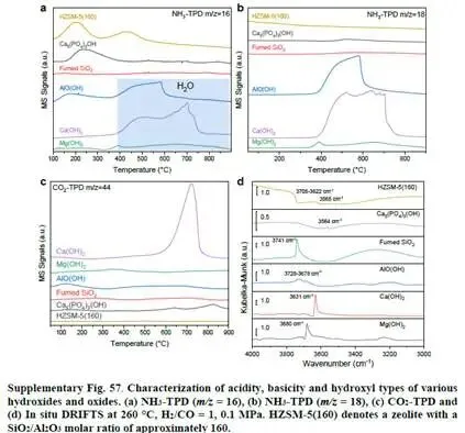 - 3646 cm⁻¹:NCM-HAP15出现明显的桥式羟基伸缩振动峰,该峰在NCM中不存在,且独立HAP或HZSM-5中也不存在(补充图57),说明该信号源于羟基促进剂与三斜相Co-Mn氧化物之间的界面。这是羟基参与催化的直接证据。