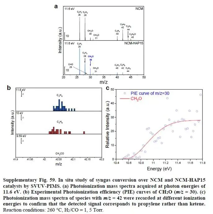补充图59的SVUV-PIMS(同步辐射真空紫外光电离质谱)检测到NCM-HAP15反应气相中m/z=30(CH₂O异构体)信号明显高于NCM,直接证实了H*辅助路径中间体的存在。