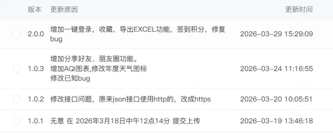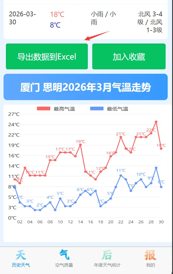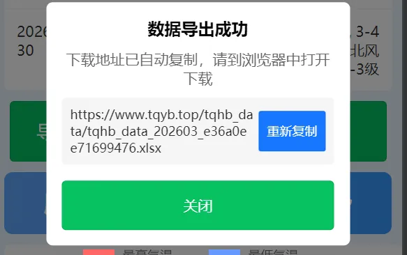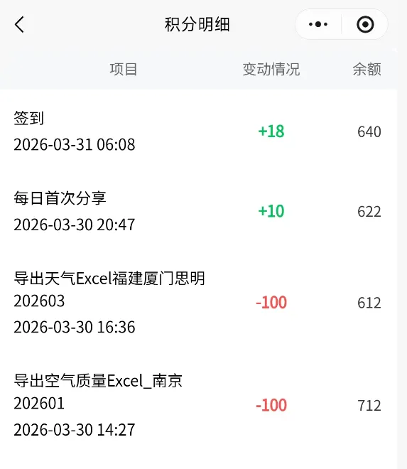 小程序的历史天气和空气质量页面下拉,找到下方绿色的按钮“导出数据到Excel”,直接点击,需要先登录,导出一次需要消耗 100个积分)。导出成功后,下载地址自动复制到剪贴板了,直接粘贴到浏览器或者发到微信中打开下载。