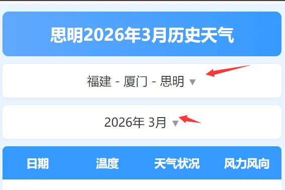 菜单中点击“历史天气”,然后页面上面选择需要查询的城市区县,再选择对需要的日期月份。