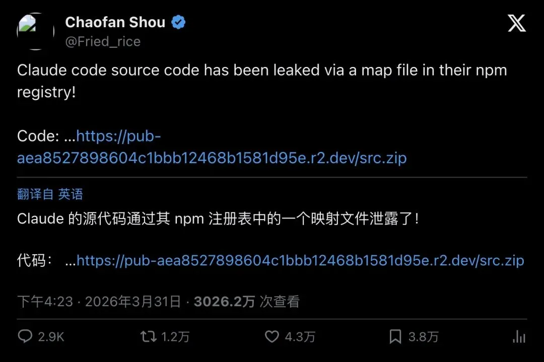 ▲ @Fried_rice 的爆料推文——4.3万点赞,3026万次查看,3.8万人收藏