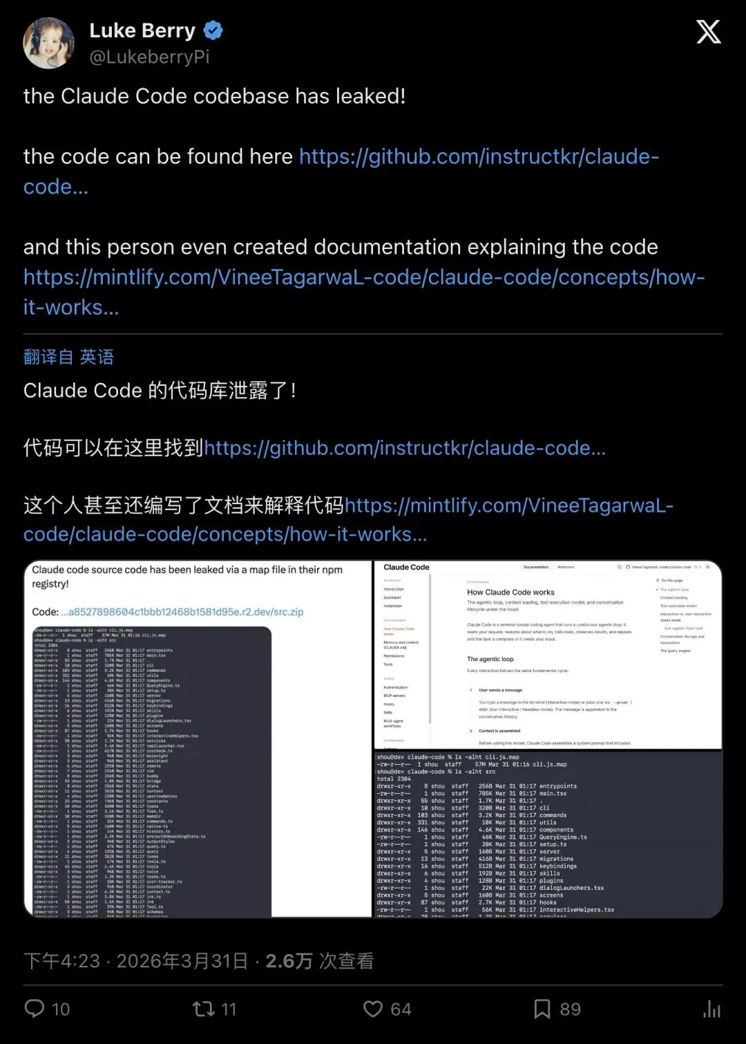 研究员 Chaofan Shou(@Fried_rice)几乎在第一时间发现了这个问题,直接在 X 上甩出了下载链接: