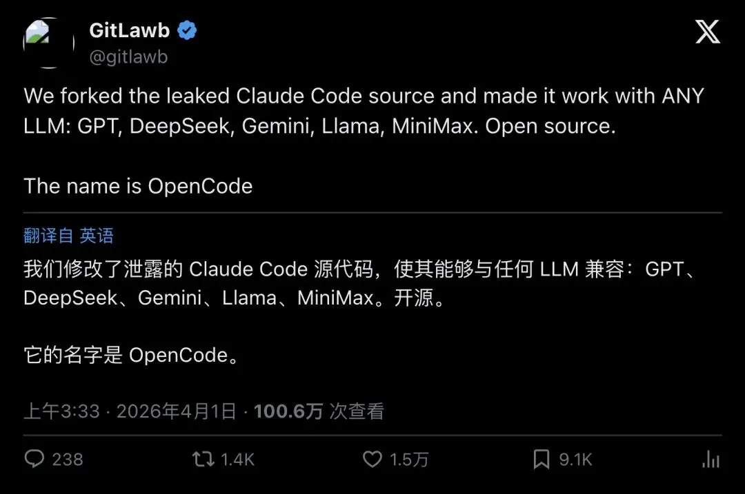 更绝的是——有团队直接 fork 了泄露代码,改造成兼容任意大模型的开源版本,取名叫 OpenCode。GPT、DeepSeek、Gemini、Llama 全都能用。