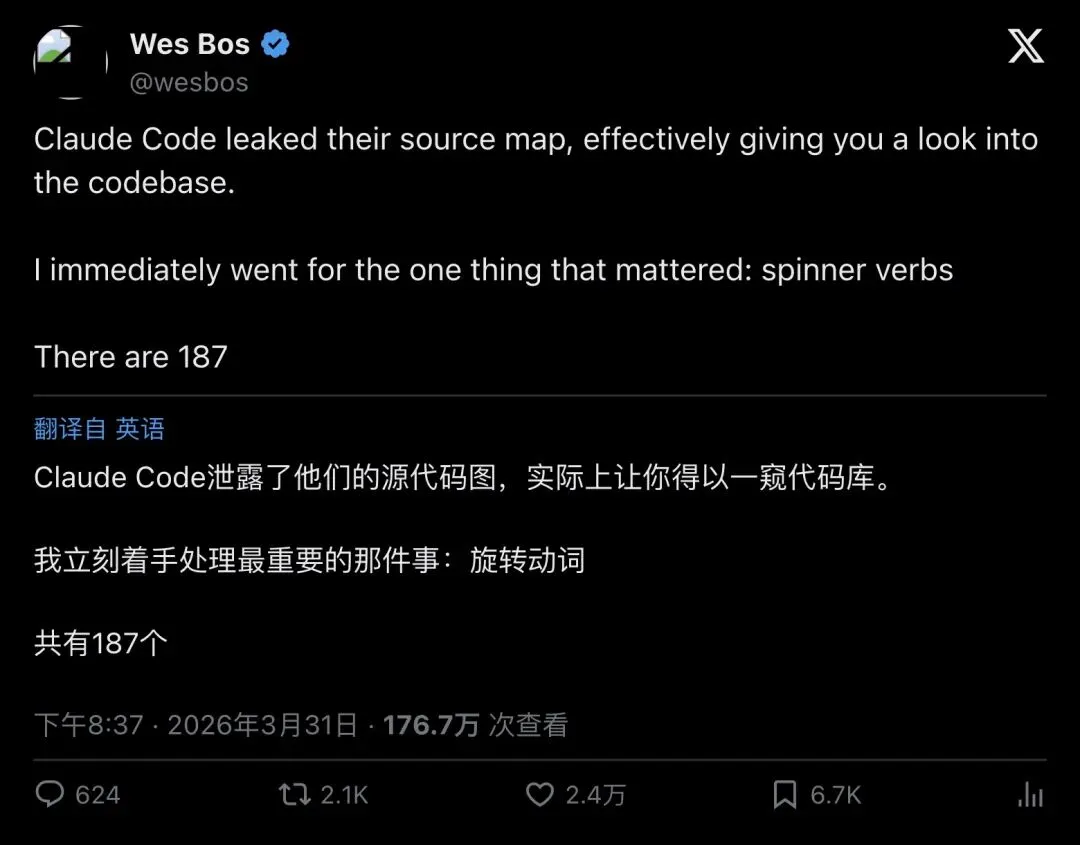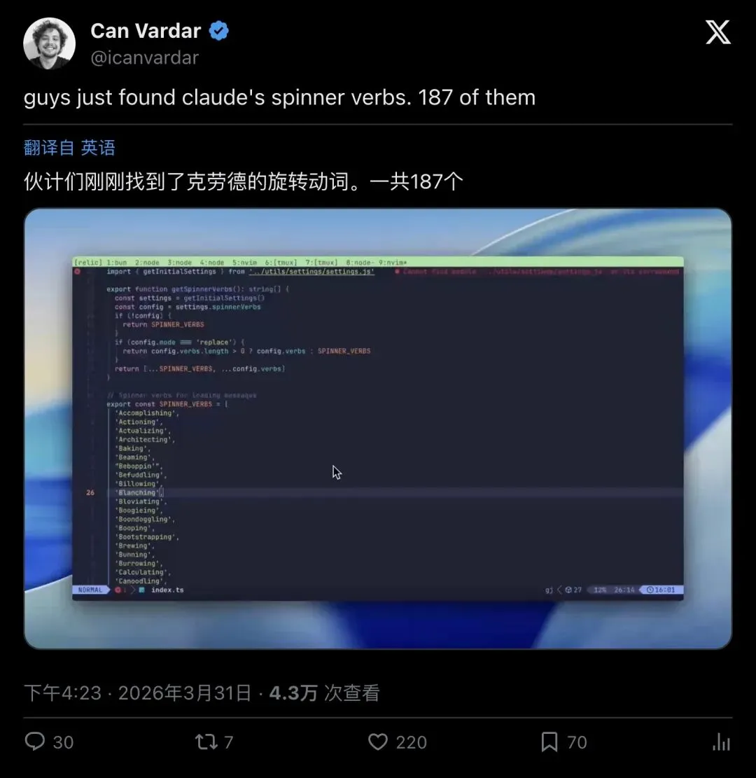 「Claude Code 泄露了源代码图,让你得以一窥代码库。我立刻着手处理最重要的那件事:旋转动词。共有187个。」