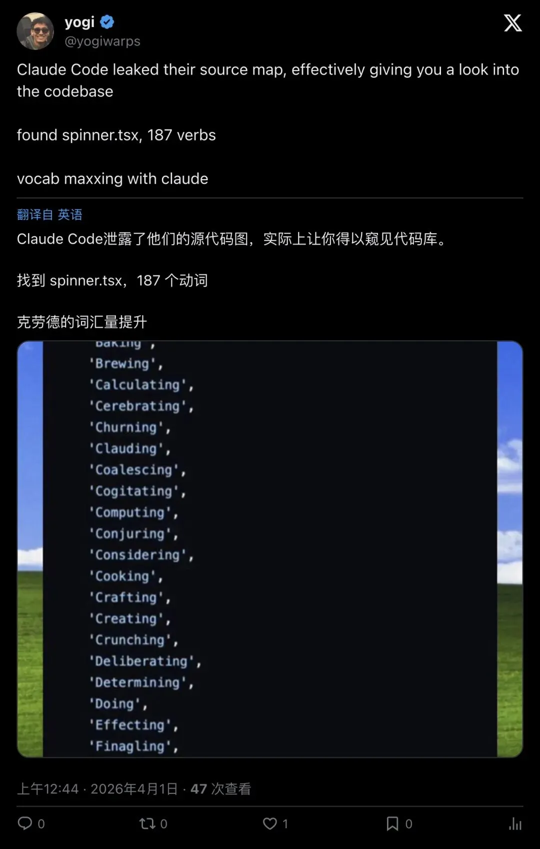 ▲ @yogiwarps:找到了 spinner.tsx,并配上了动词列表截图——”vocab maxxing with claude”