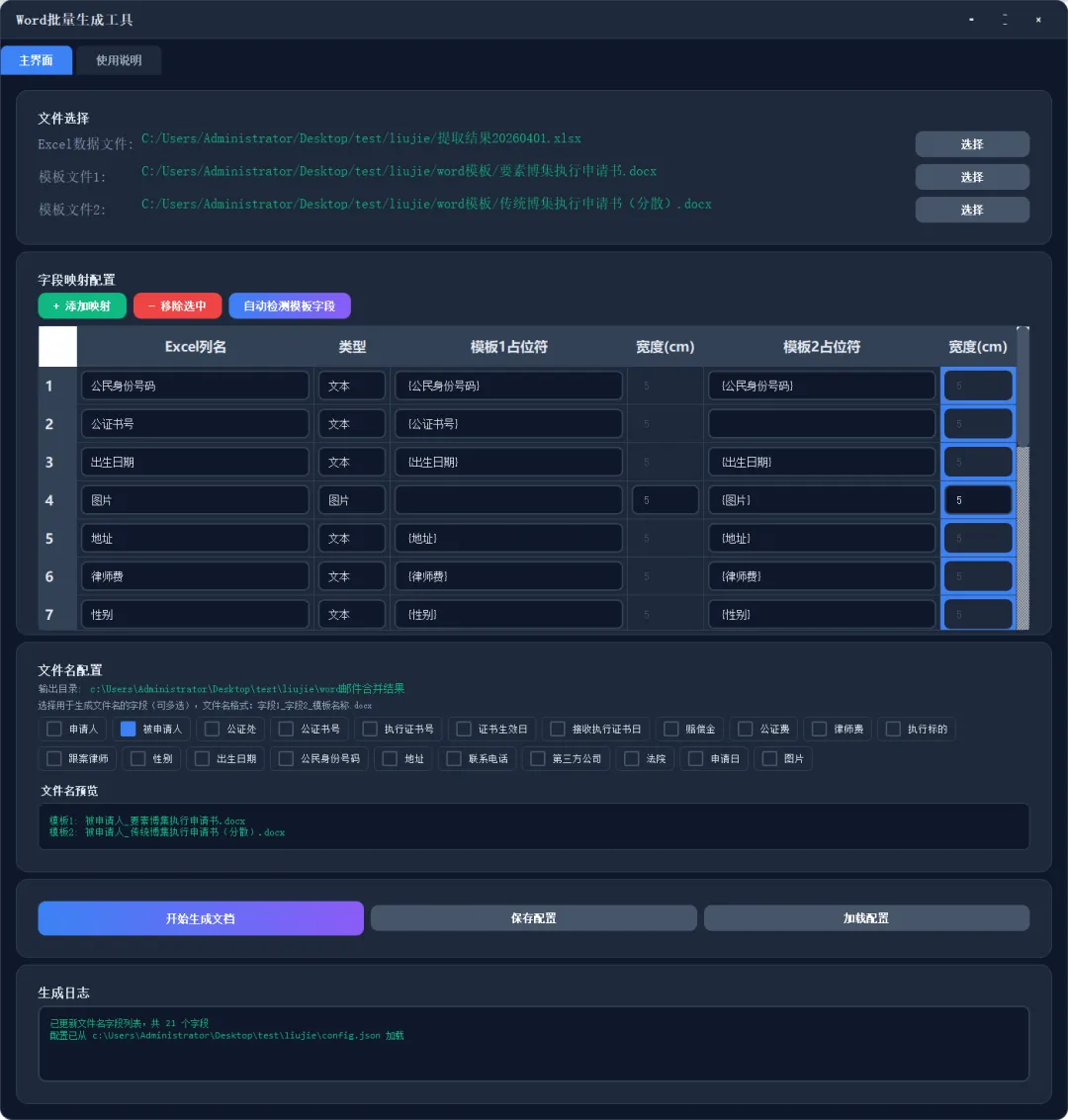 可视化配置Excel列与Word占位符的对应关系,自动检测模板字段