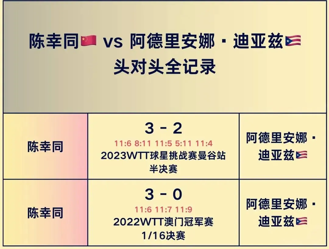 陈幸同与迪亚兹有过两次历史交手记录,陈幸同两战全胜,占据信心上风。迪亚兹最近涨球比较明显,去年还曾经战胜过国乒主力王艺迪。陈幸同这场比赛,需要释放出自己叹息之墙的防守厚度,先抗住迪亚兹的冲击,然后再寻求转换时机。