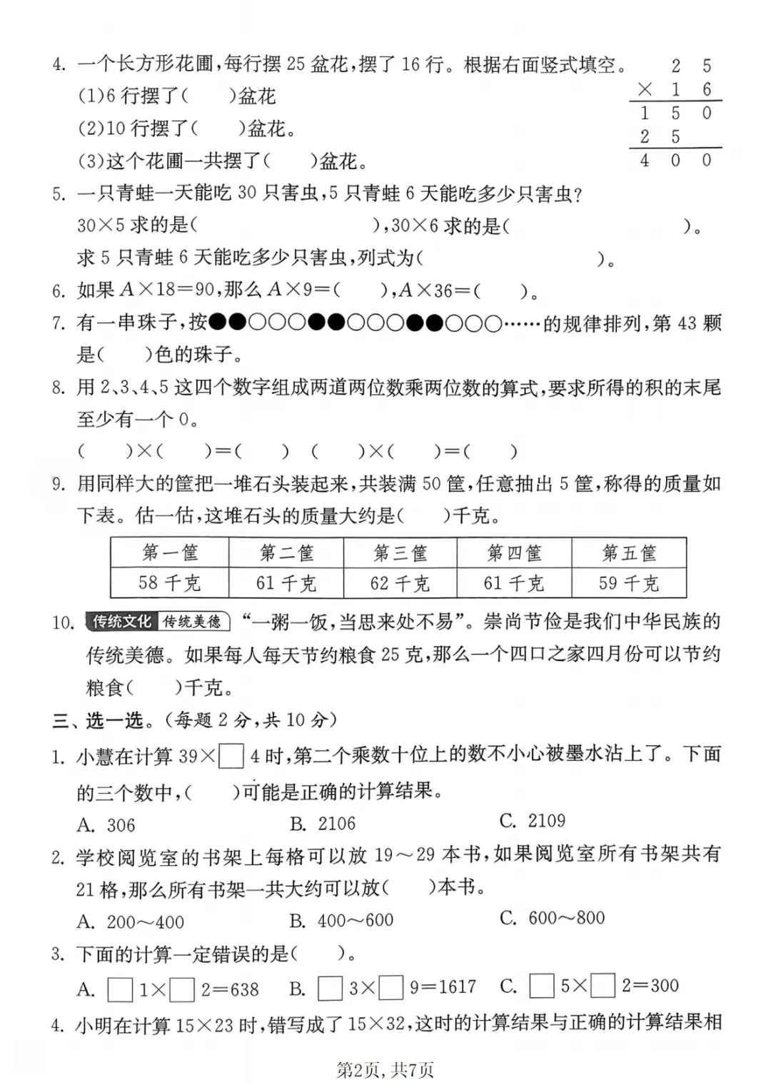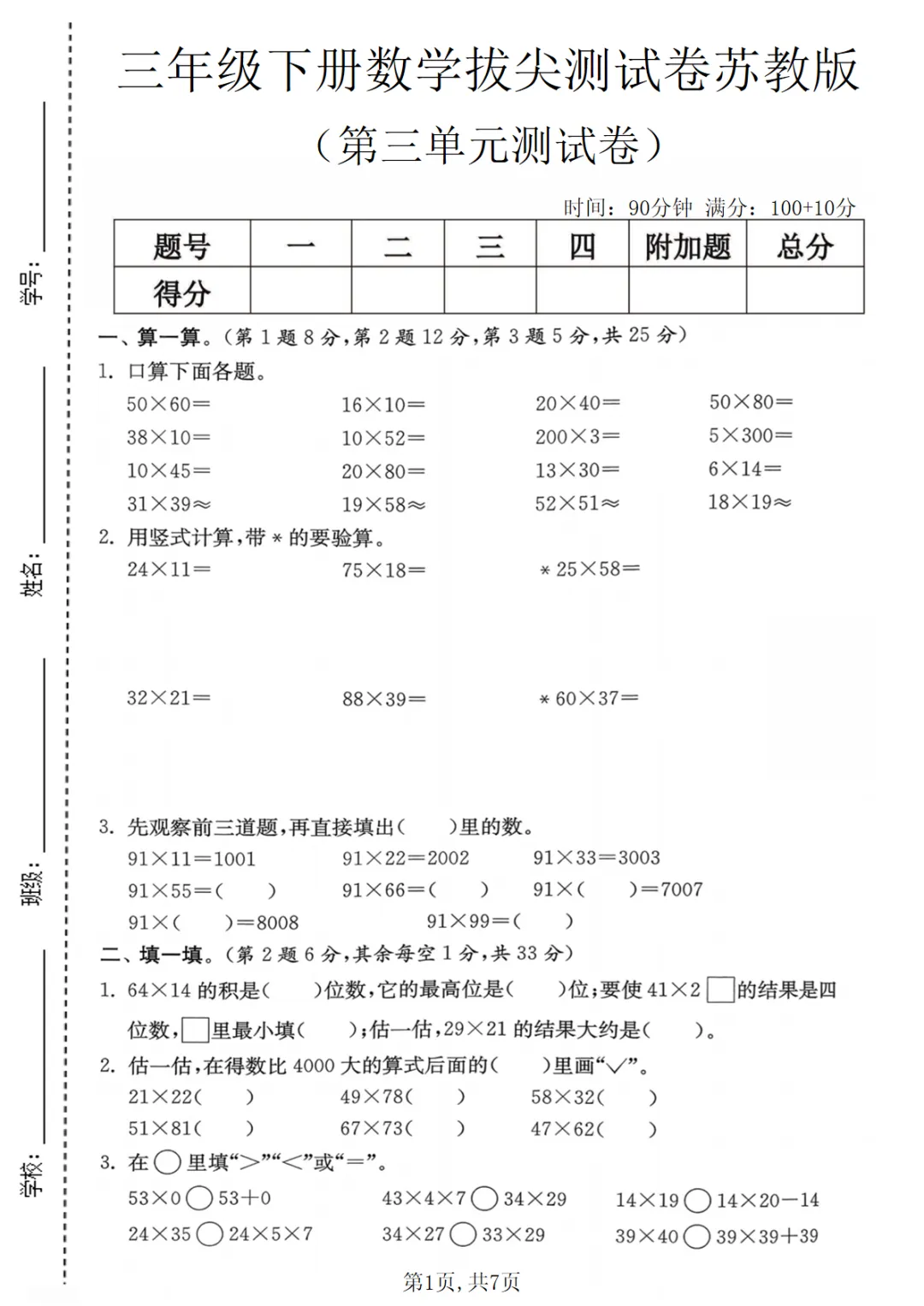 【免费下载】三年级(下)数学 第三单元拔尖测试卷《苏教版》,PDF电子版,可打印