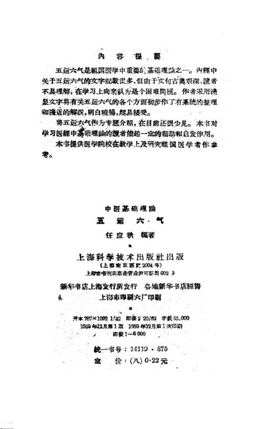 1959年12月,上海科学技术出版社出版了中医基础类书籍《五运六气》,由当代著名中医学家任应秋编著,是新中国成立后系统阐释五运六气学说的经典版本,也是中医学习者入门该领域的重要指引。
