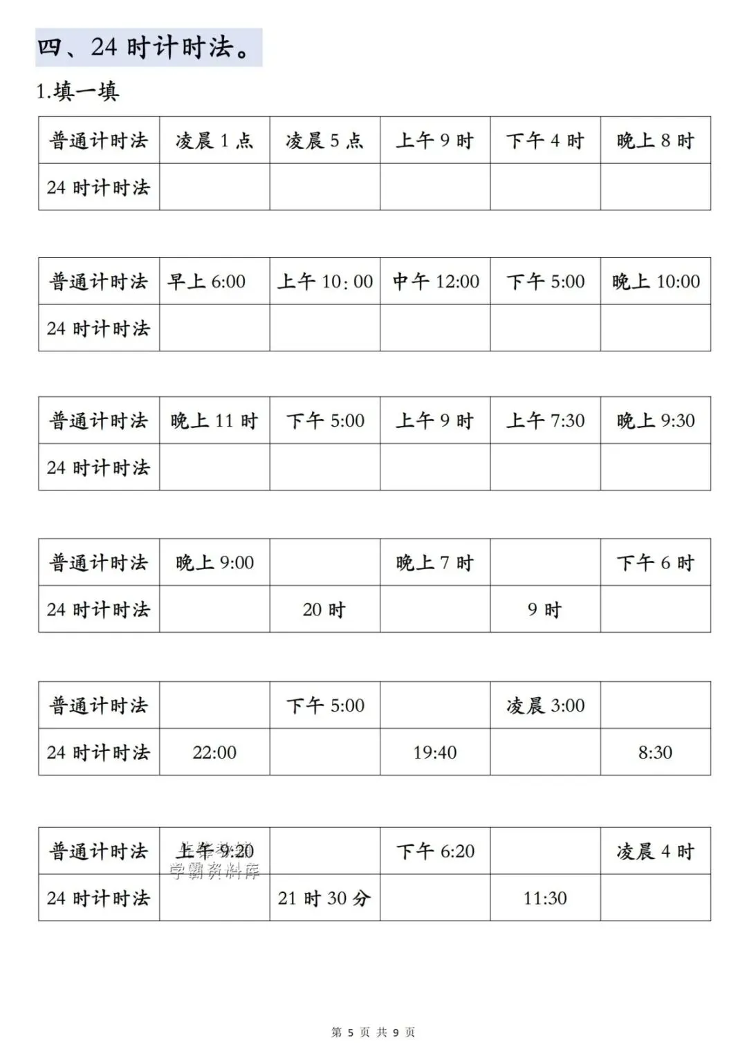 这份练习全面覆盖时间单位换算、大小月、季度、平年闰年判断、24 时计时法转换、生活情境计算、思维提升题,从填空、判断、选择到实操大题,完全贴合试卷结构,每一道题都是高频考点与典型易错点。孩子不用盲目刷题,练一套就能把整个单元知识彻底吃透。
