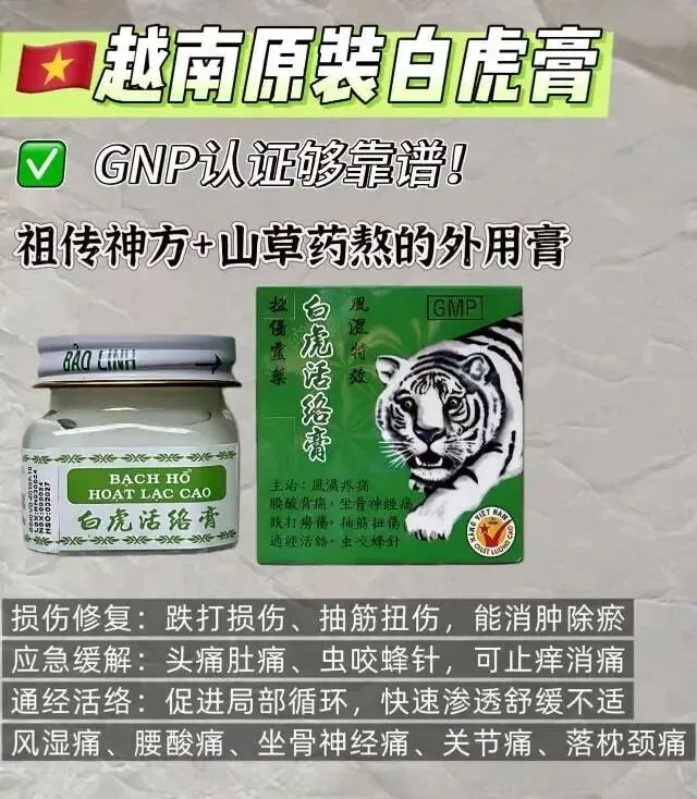 越南白虎活络膏20g,是一种根据越南民间祖传秘方研制,采用名山药草及高级药料的止痛膏。功能主治:风湿疼痛,腰酸背痛,坐骨神经痛,关节炎痛,跌打劳伤,抽筋扭伤,消肿除淤,头痛肚痛,止痒消斑,通经活络等功效。