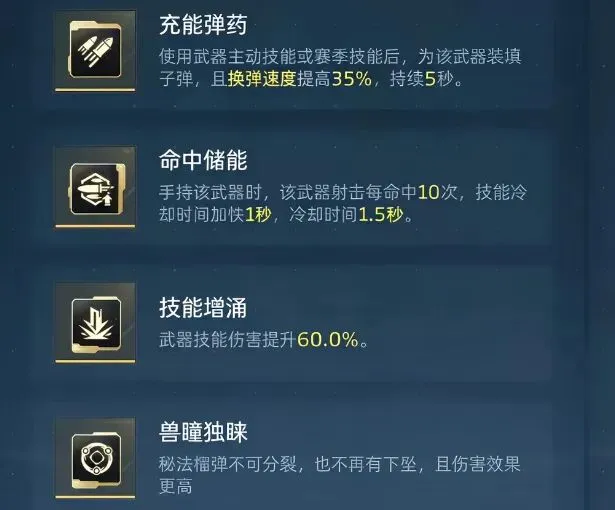 ◦ 充能弹序:加快秘法榴弹的充能速度,让爆发周期更短。