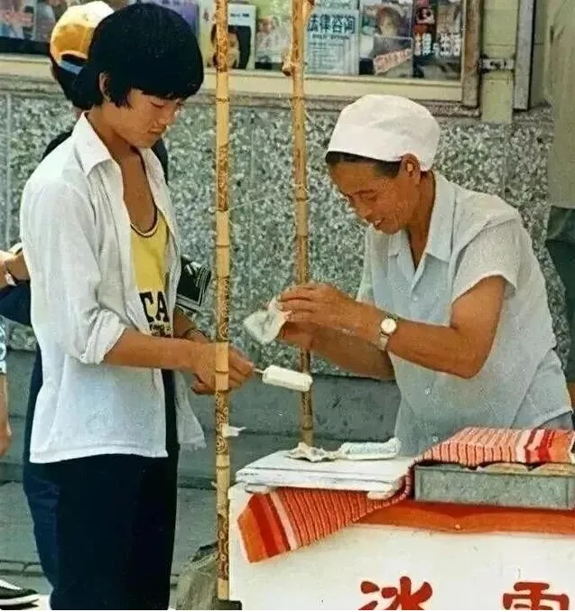 这张就是路边买冰棍的场景,老奶奶支个摊,冰棍一大锅,全是人工做的,小豆冰棍、奶油雪糕、赤豆棒冰,五分钱能买一根,夏天放学一堆人围着抢,冰棍化得快,边走边舔,结果融了一手黏糊糊,妈妈看见只能摇头笑,前段时间还跟邻居说,现在满冰箱雪糕也没有那种盼头。
