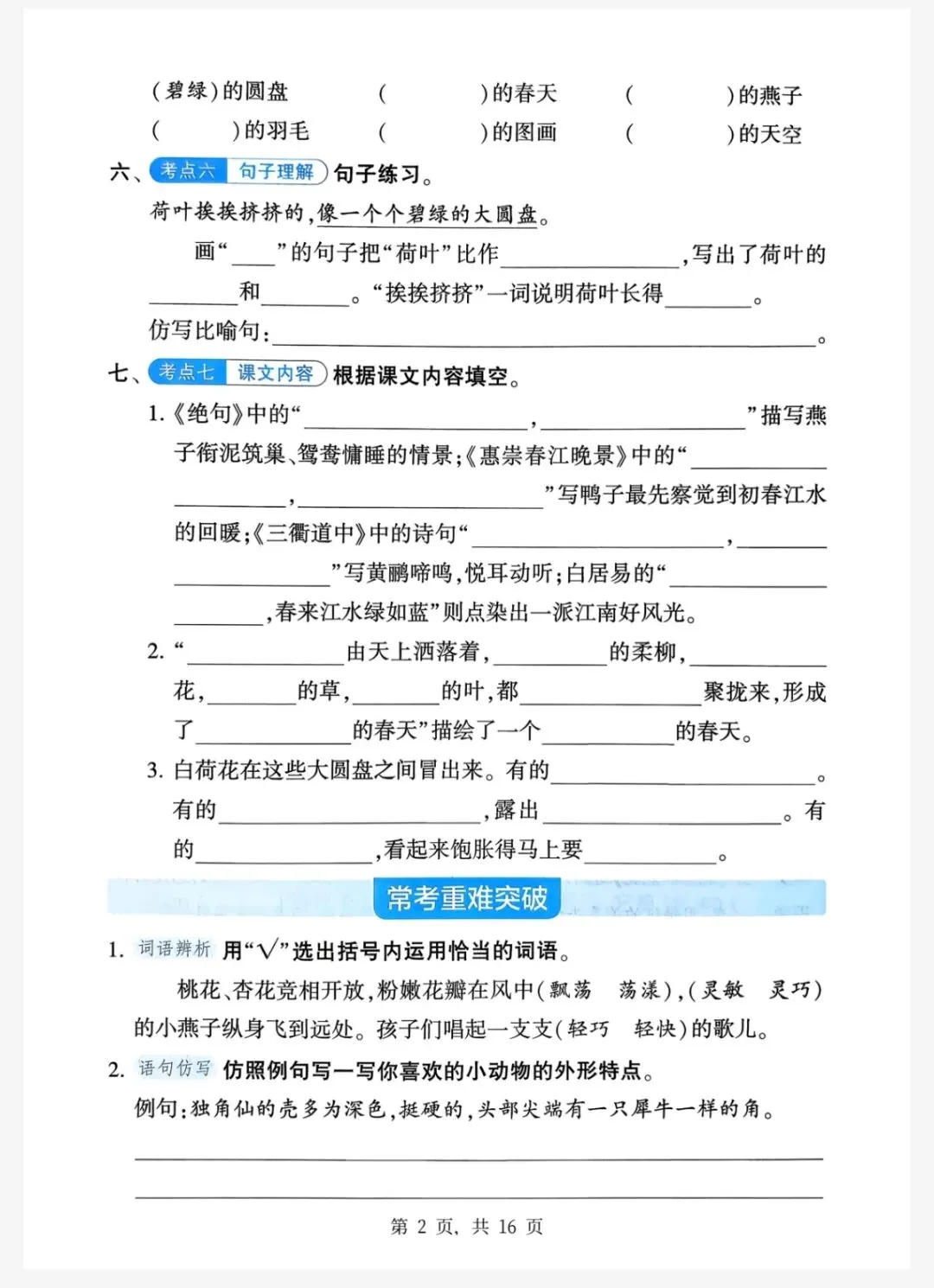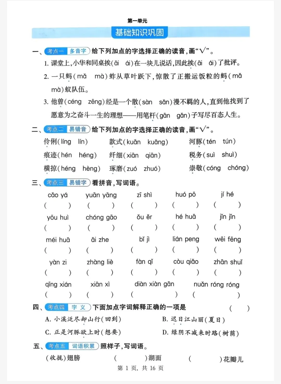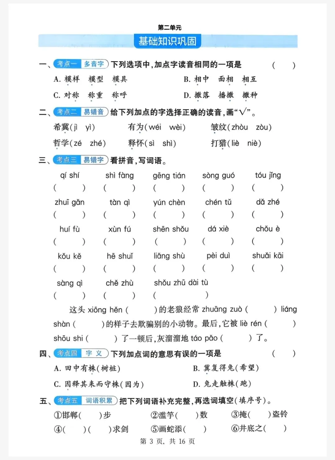 三年级语文下册 单元基础知识巩固 电子版可下载打印