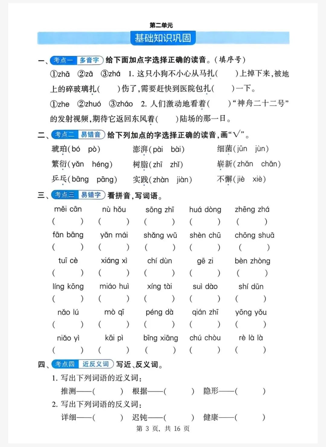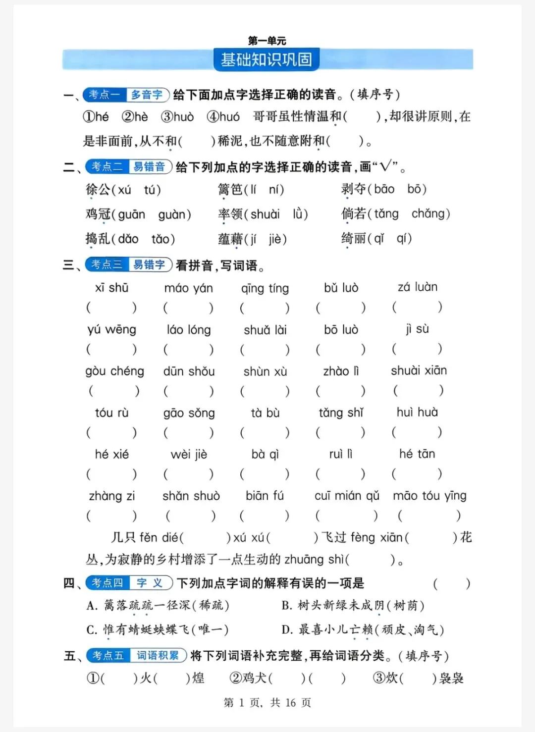 四年级语文下册 单元基础知识巩固 电子版可下载打印