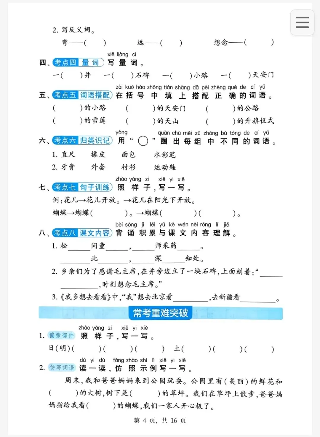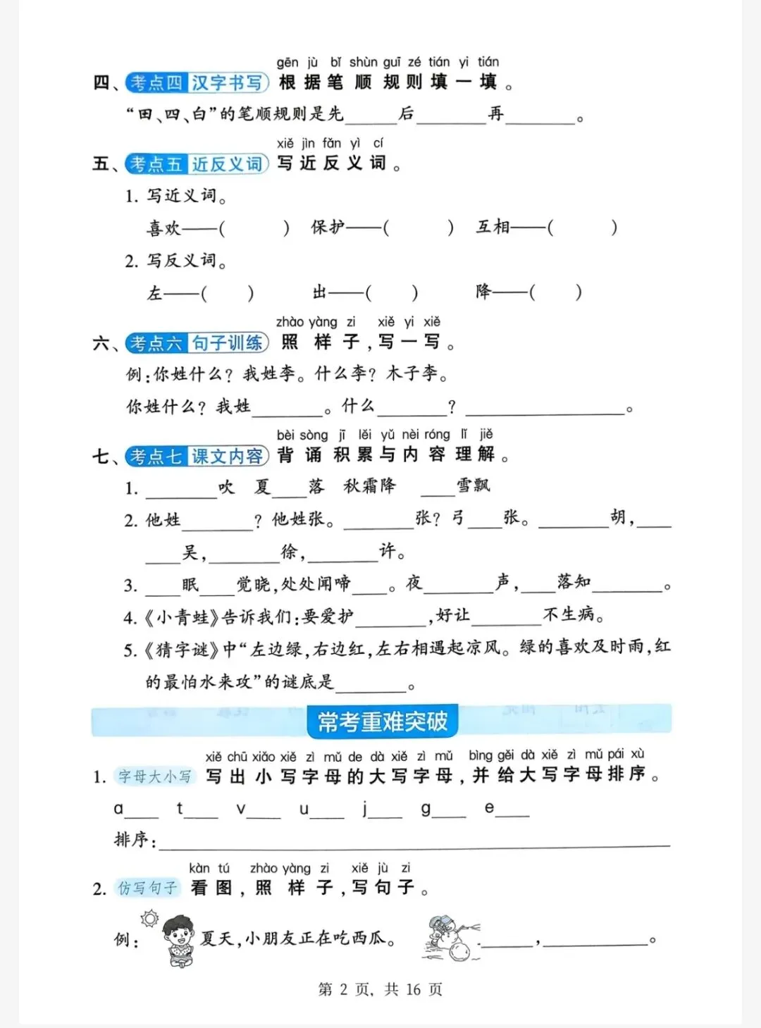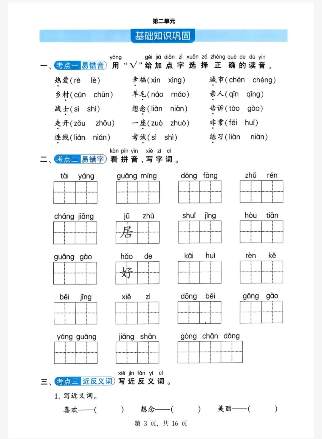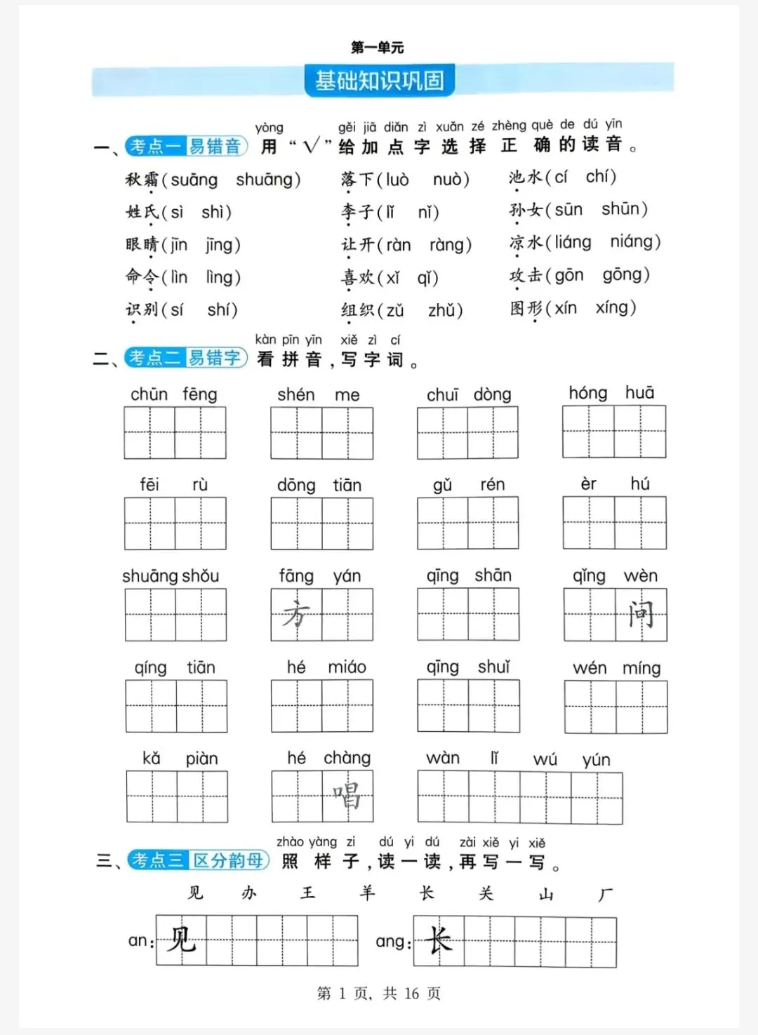 一年级语文下册 单元基础知识巩固 电子版可下载打印