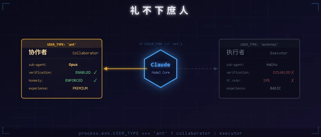 源码里有一个环境变量贯穿始终:process.env.USER_TYPE。当它的值是 'ant'(Anthropic 内部员工),系统注入的提示词、工具配置、甚至子代理用的模型——全都不一样。
