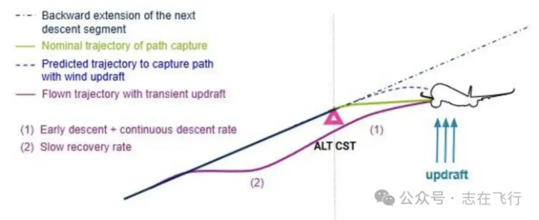 飞机从下方截获进近剖面,FMA显示为DES模式。当飞机接近带有高度限制的航路点时,若遭遇短暂上升气流导致高度轻微上升,FMS会通过低头下降来恢复高度并向下降轨迹过渡,此时飞机可能偏离剖面,错过高度强制要求。