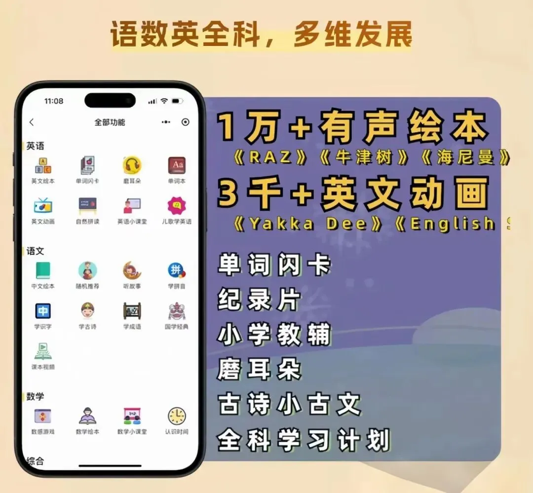 ✅ 语文衔接:拼音识字、古诗成语、中文绘本、学写字,从幼小衔接到一年级知识点全覆盖,帮孩子打好语文基础