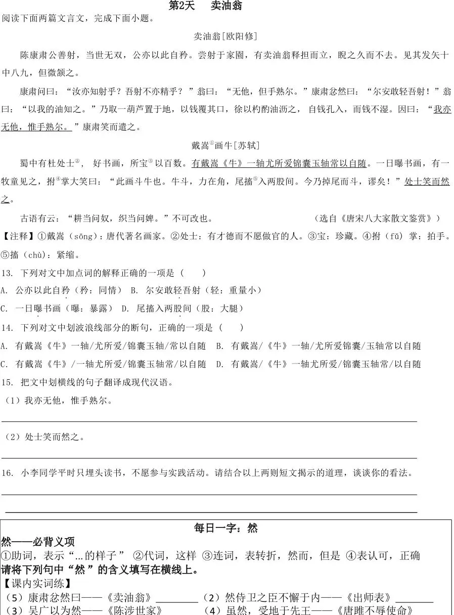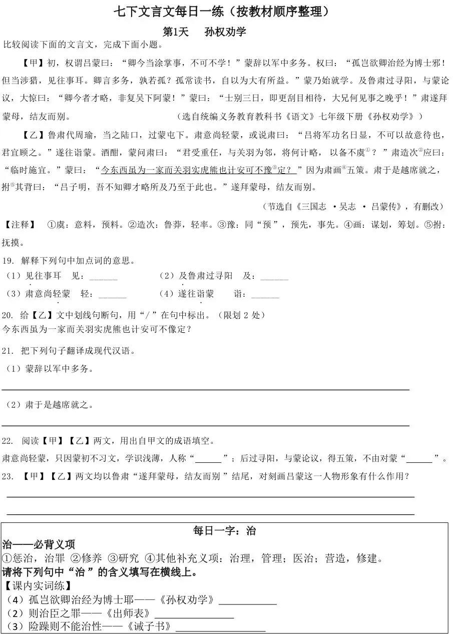 七下语文|课内文言文 一课一页+答案(可打印电子版) 今天为大家分享 【课内文言文 一课一页+答案】 文末下载电子版 完整电子版获取方式如下: 七下语文课内文言文 一课一页+答案链接: https://pan.baidu.com/s/1CvytAg5OcfhKY5Jn96LPvw?pwd=2v8a 复制这段内容打开「百度网盘APP 即可获取」 想获取七下语文其他内容请点下方链接: 七下语文|每课重难点每日一练电子版(可打印) 七下语文|读读写写字词注音电子版(可打印) 七下语文|第一次月考考前押题清单(可打印电子版) 七下语文|课内古诗词 一课一页+答案(可打印电子版) 七下语文|必背古诗文逐篇默写+答案(可打印电子版) 七下语文|古诗文早背晚默任务单(可打印电子版) 想获取其他初中语文资料的朋友,请关注下方公众号,私信或留言资料名称,无偿分享~ 注:本账号分享内容为网络整理,侵删致歉。 麻烦大家点赞+转发,你的每一份支持,都是我持续更新分享的动力,万分感谢!!!