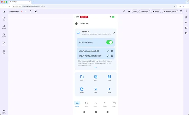 首先最戳人的一点,就是它把隐私做到了极致。现在好多管理类 APP,要么要注册账号,要么数据得传云端,总怕信息泄露。但 PlainApp 全程都在本地局域网里跑,不管是传文件、看短信,还是投屏、远程控屏,数据压根不会出你的本地网络,更不会发给任何第三方服务器。而且手机和浏览器之间的连接还做了加密,就算是家里的局域网,也不用担心被蹭网的人盯上,用着是真踏实。关键它连 Firebase 分析、推送这些可能偷传数据的东西都没有,崩溃报告也是要手动开才会有,全程零隐私风险。