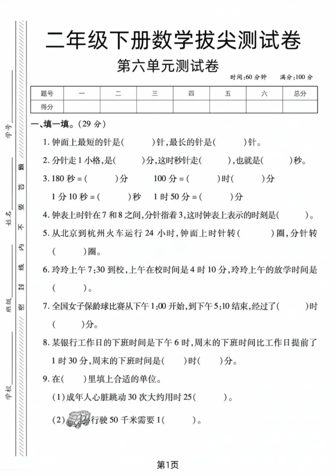 【免费下载】二年级(下)数学 第六单元测试卷《西师版》,PDF电子版,可打印