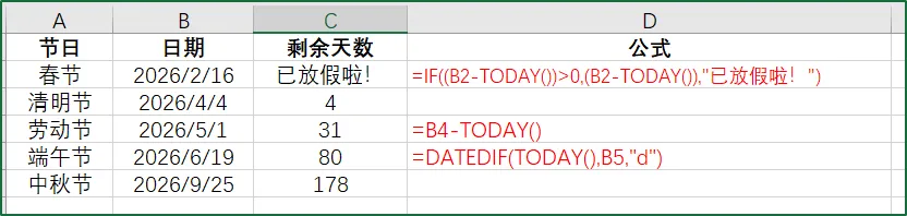 =IF((B2-TODAY())>0,(B2-TODAY()),"已放假啦!")