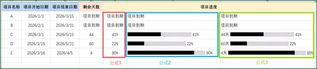 =IF(ISNUMBER(D2),1 - (C2-TODAY()) / (C2-B2),"项目到期")