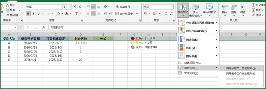 ⑤初始选择整列为数据区域,设置完成后,需将首行的规则清除,【选中首行–条件格式–清除规则–清除所选单元格的规则】。