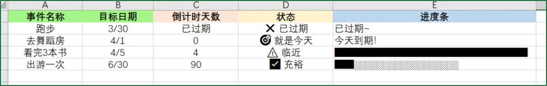 =IF(ISNUMBER(C2),IF(C2>0, REPT("█", MAX(0, MIN(20,20-INT(C2/5)))) & REPT("░", MAX(0, MIN(20, INT(C2/5)))), "今天到期!"),"已过期~")