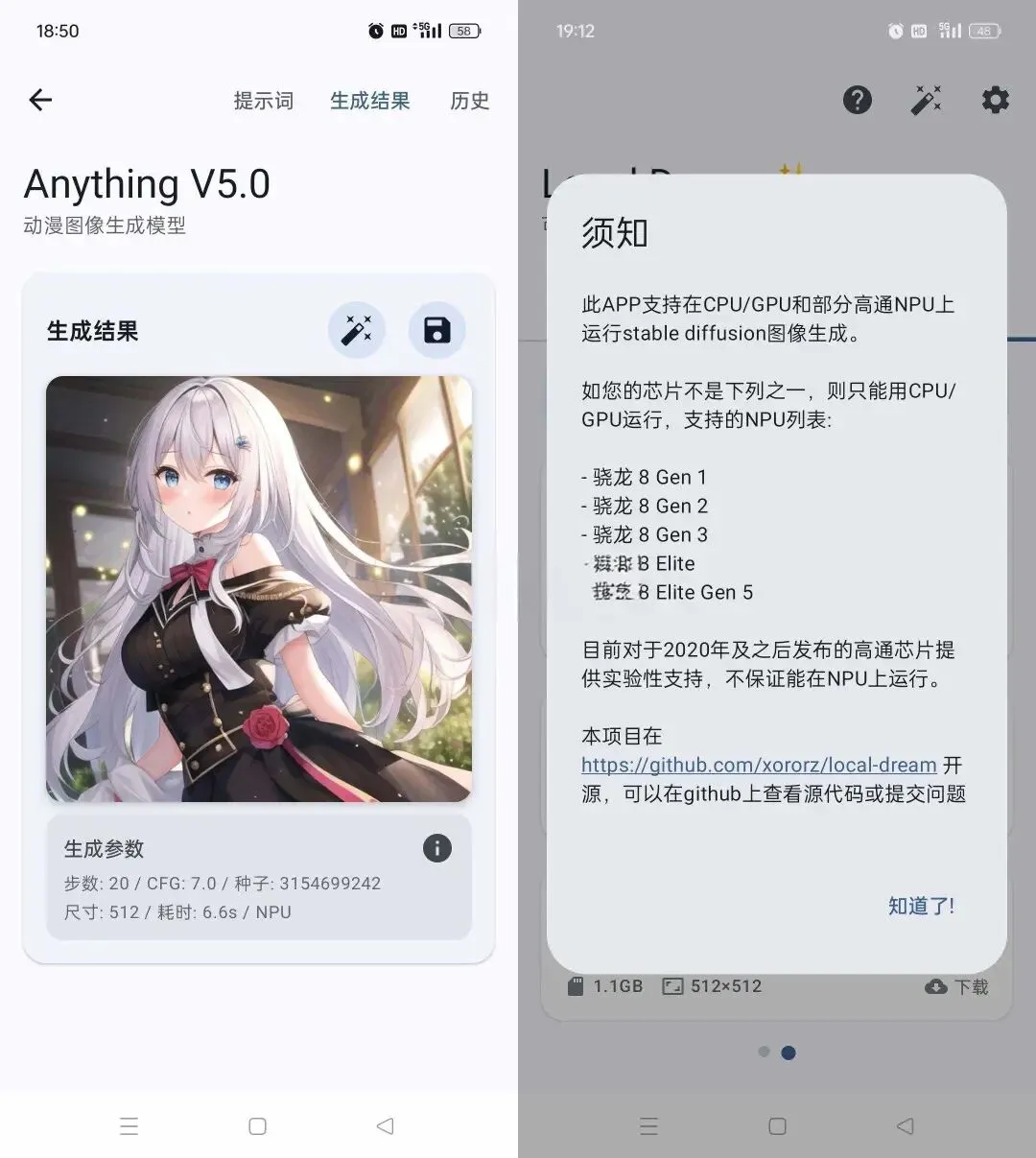 这软件对高通芯片优化得最好。如果你是骁龙8系列的机主,恭喜你,你有NPU加持,快得飞起。如果你是其他芯片(比如天玑、或者老款骁龙),它也能用CPU或者GPU跑,就是速度会慢一点,可能要等个一两分钟。但!它依然能跑!依然能生成图!