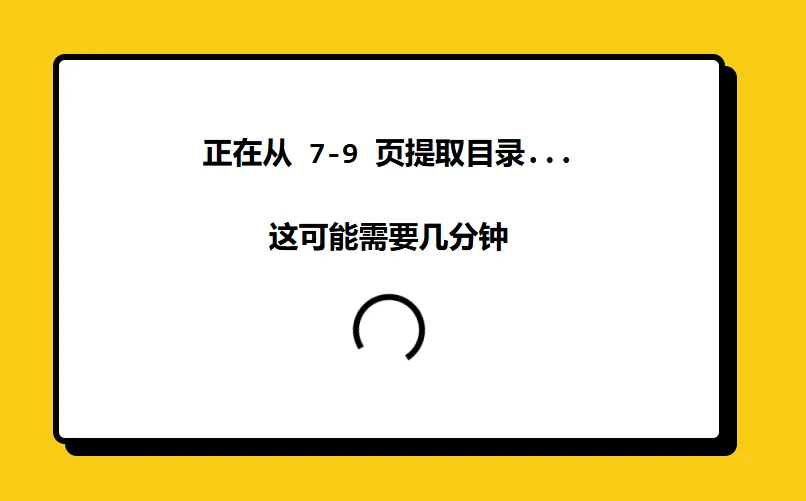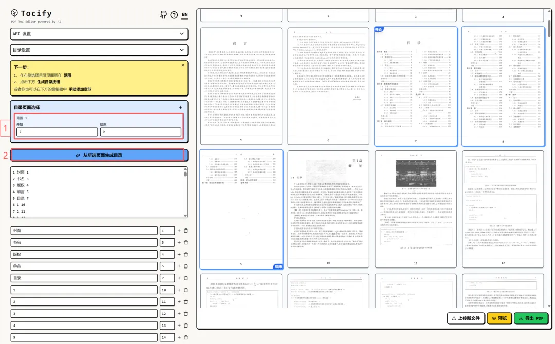 1.打开上述在线工具,将无目录的PDF文件上传至平台;2.在工具界面中,选择PDF内实际包含目录的页面范围(示例为7-9页);3.点击“生成目录”按钮,启动目录生成流程。