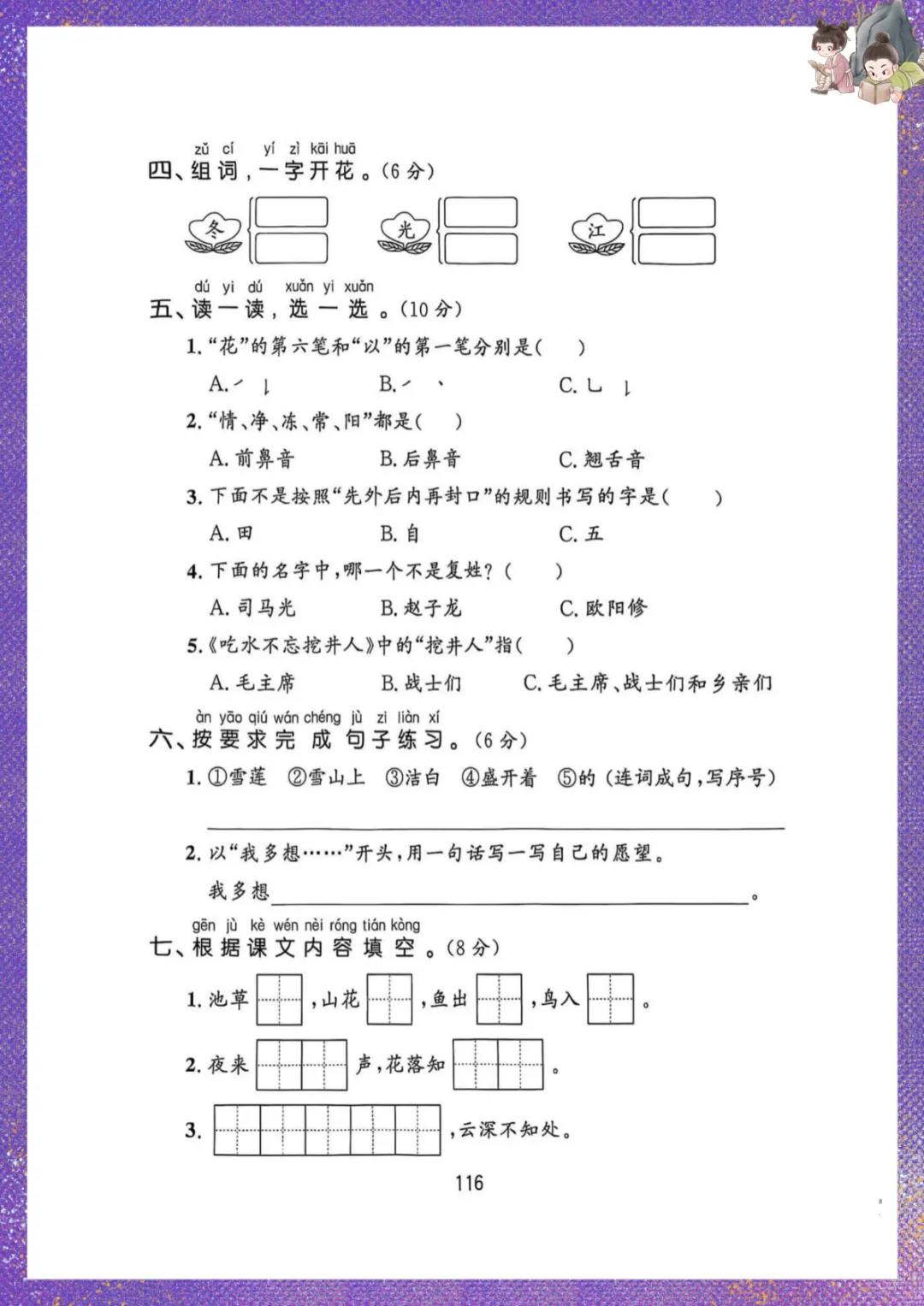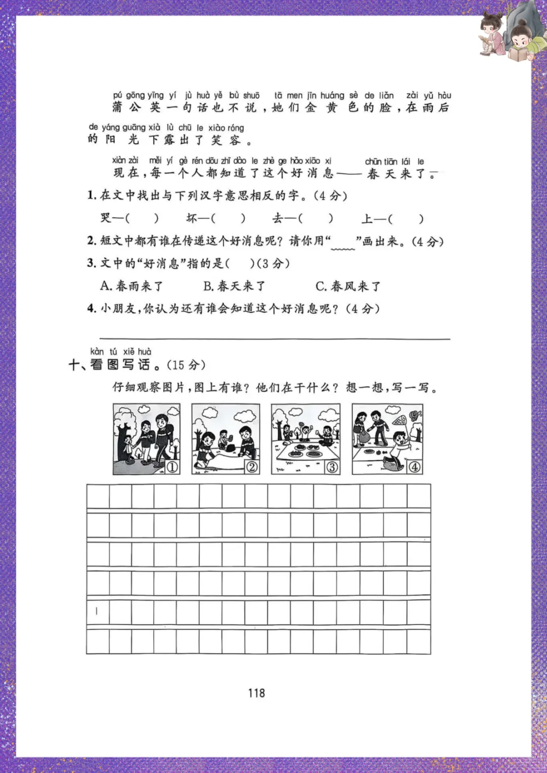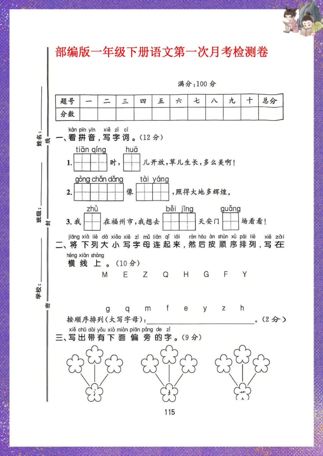 部编版一年级下册语文:第一次月考检测卷 电子版可下载打印