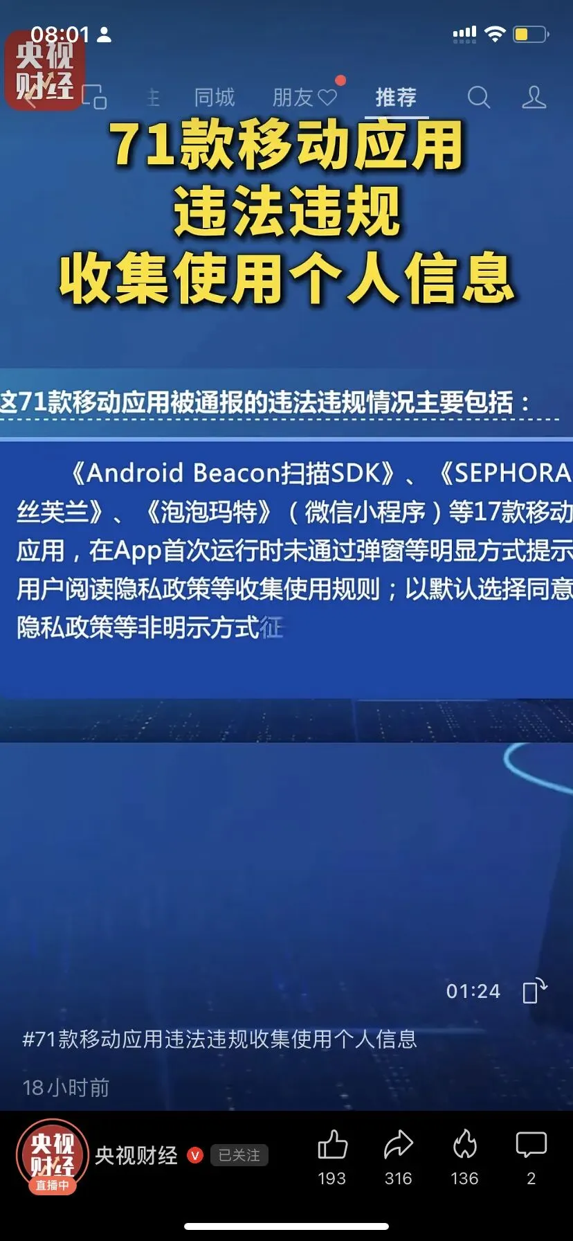 近日,央视财经重磅曝光:监管部门通报71款移动应用存在违法违规收集、使用个人信息的行为,其中不乏丝芙兰、泡泡玛特等大众熟知的品牌App,甚至包含微信小程序,引发全网哗然。这不是一次普通的通报,而是对整个互联网行业隐私乱象的又一次重拳出击,每一个手机用户,都该警惕!