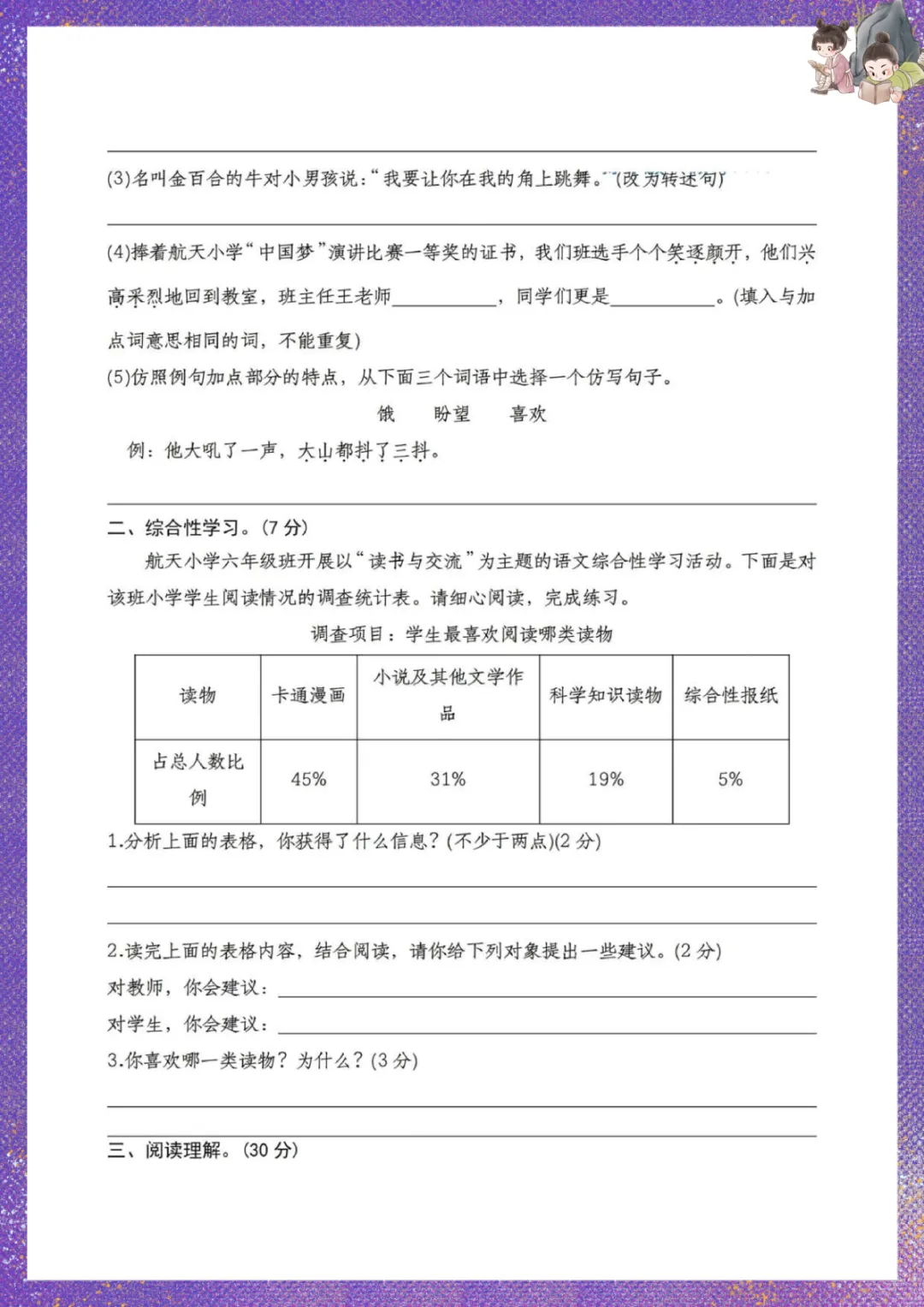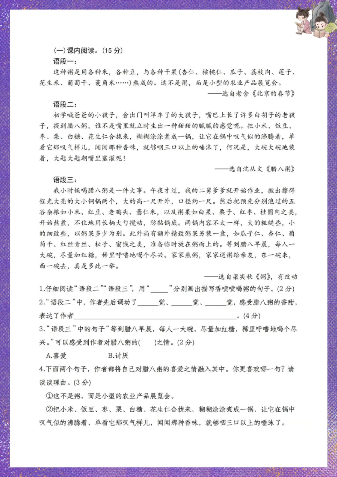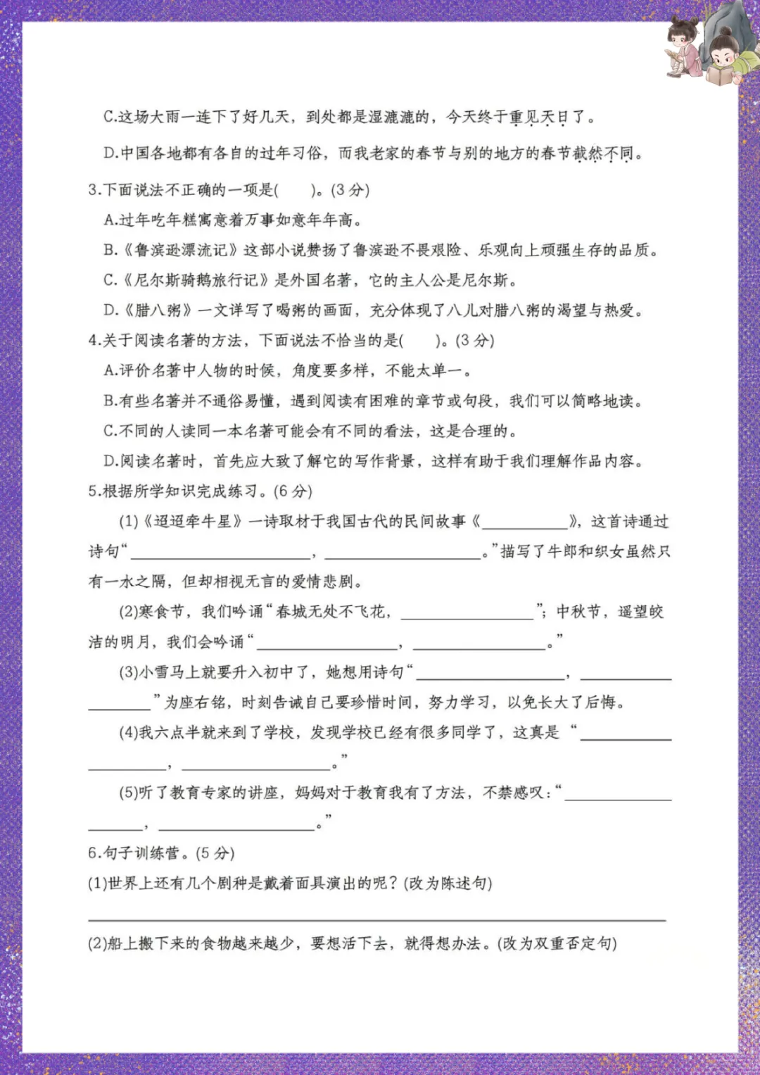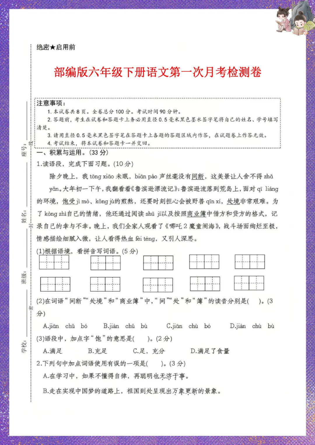 部编版六年级下册语文:第一次月考检测卷 电子版可下载打印
