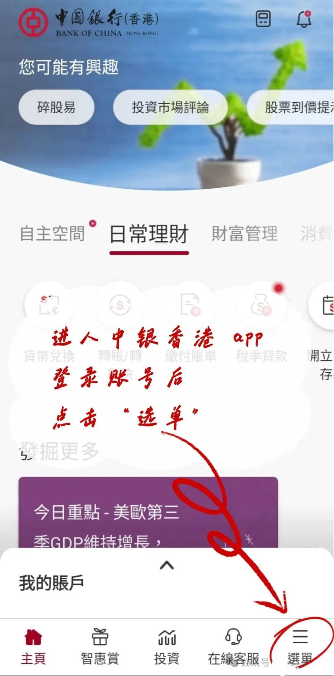 打开中银香港APP,登录个人账户后,点击右下角”选单”。