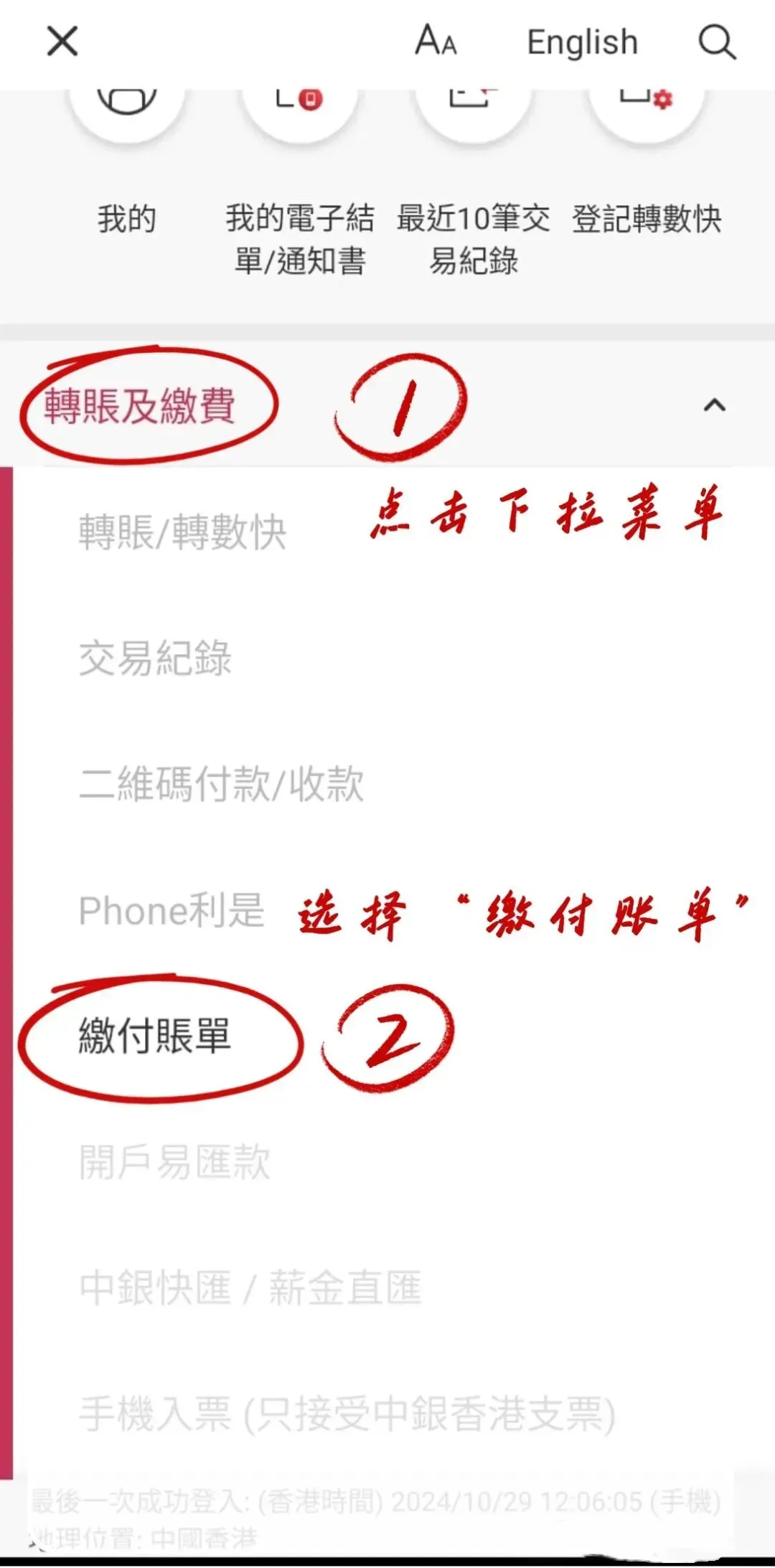 在菜单中选择”转账及缴费”下的”缴付账单”选项。