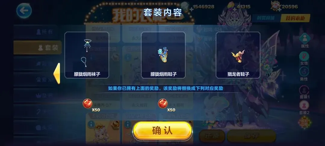 截止推文前,“朦胧烟雨&猎龙者”的套装装扮时存在异常状况,具体表现为朦胧烟雨套装异常多一件需全部单独穿戴:在各个零散配件中装扮即可