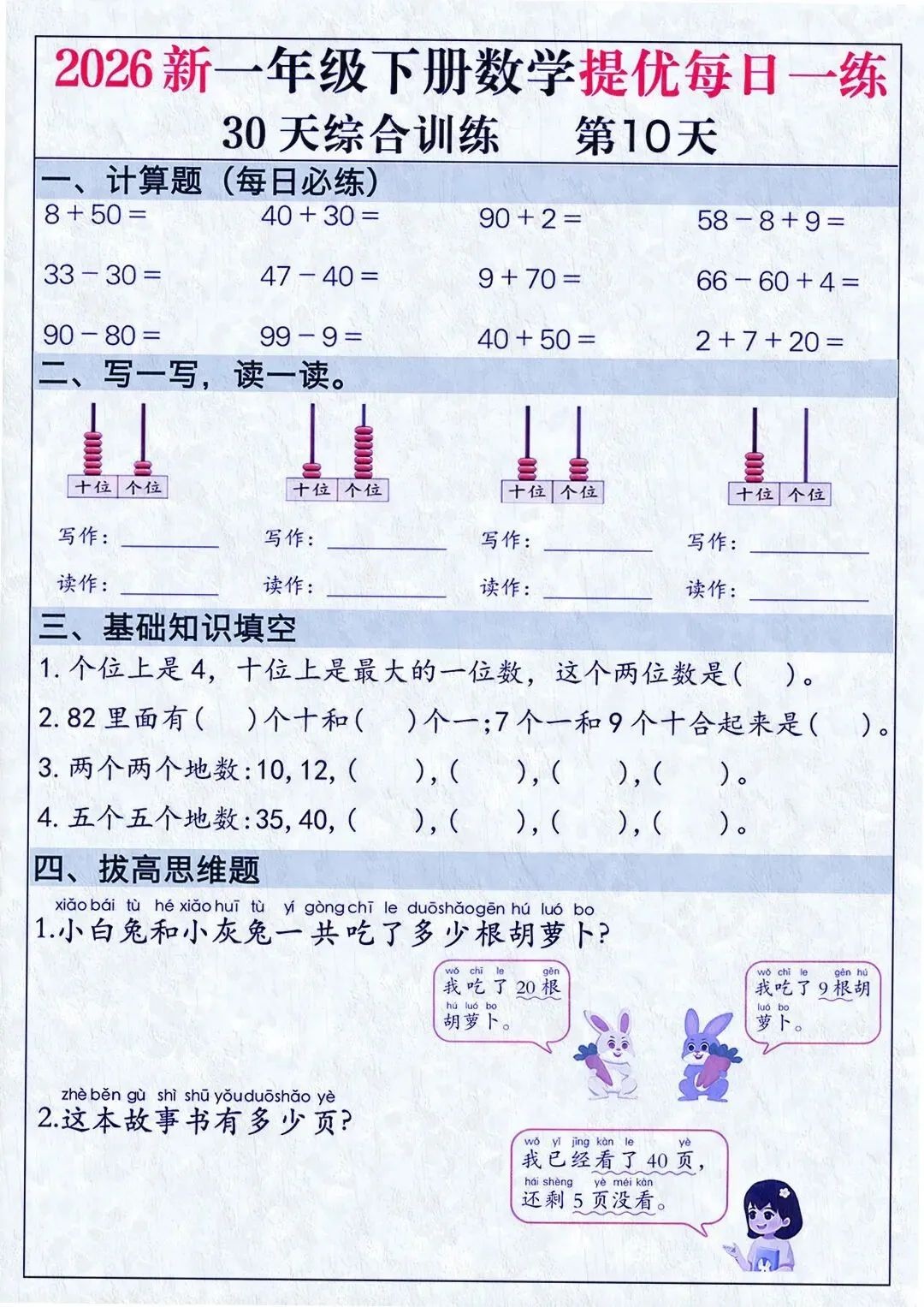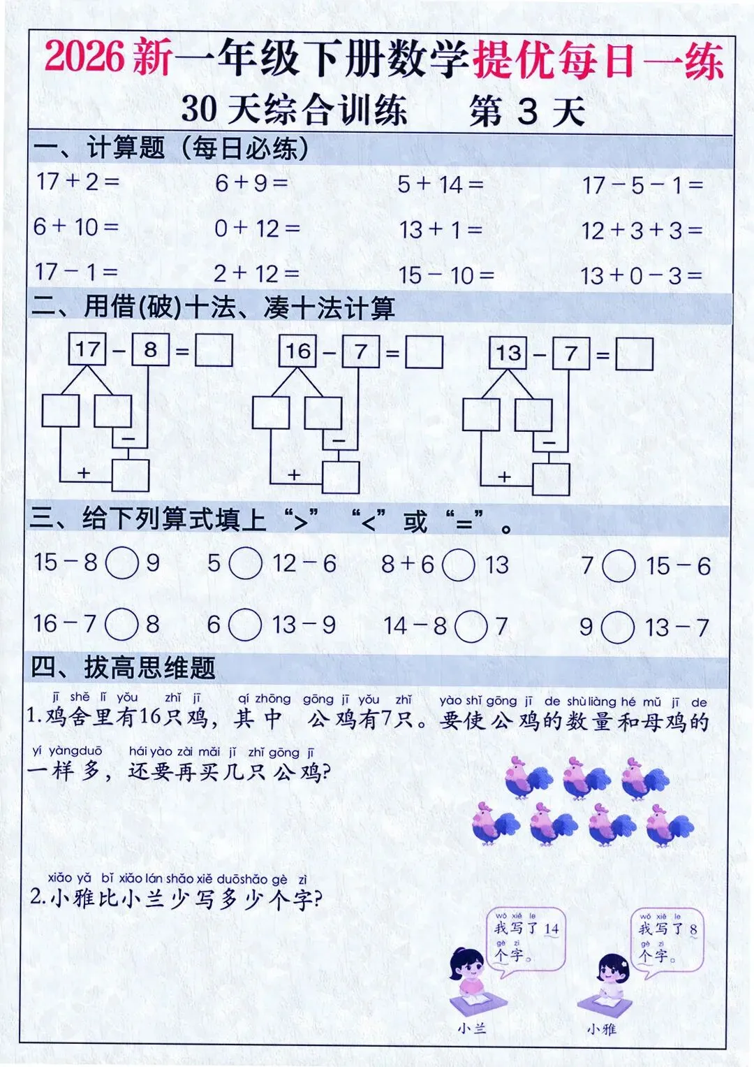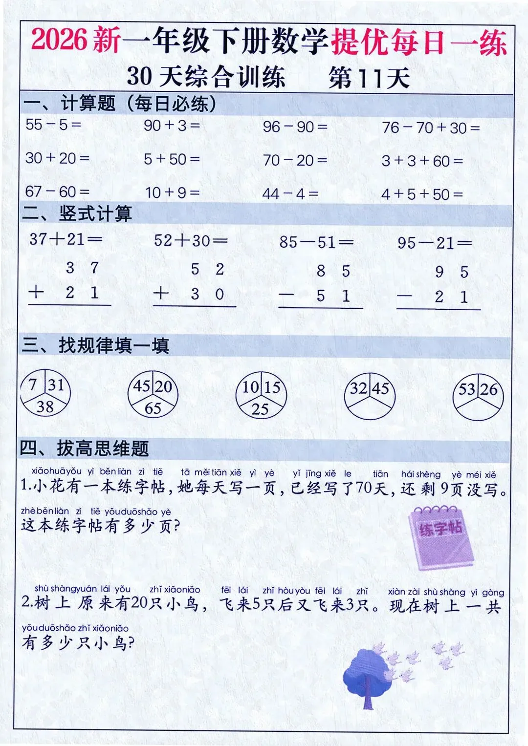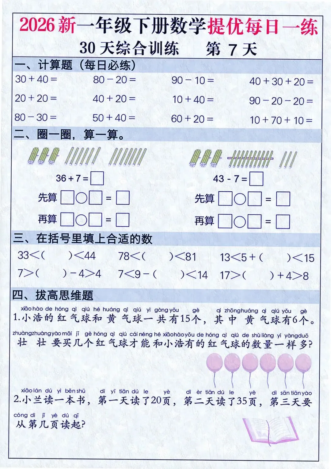 26新一年级下册数学综合提优每日一练高清可打印PDF