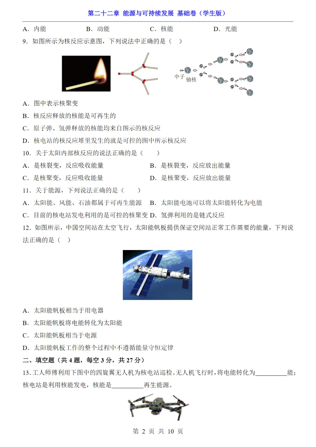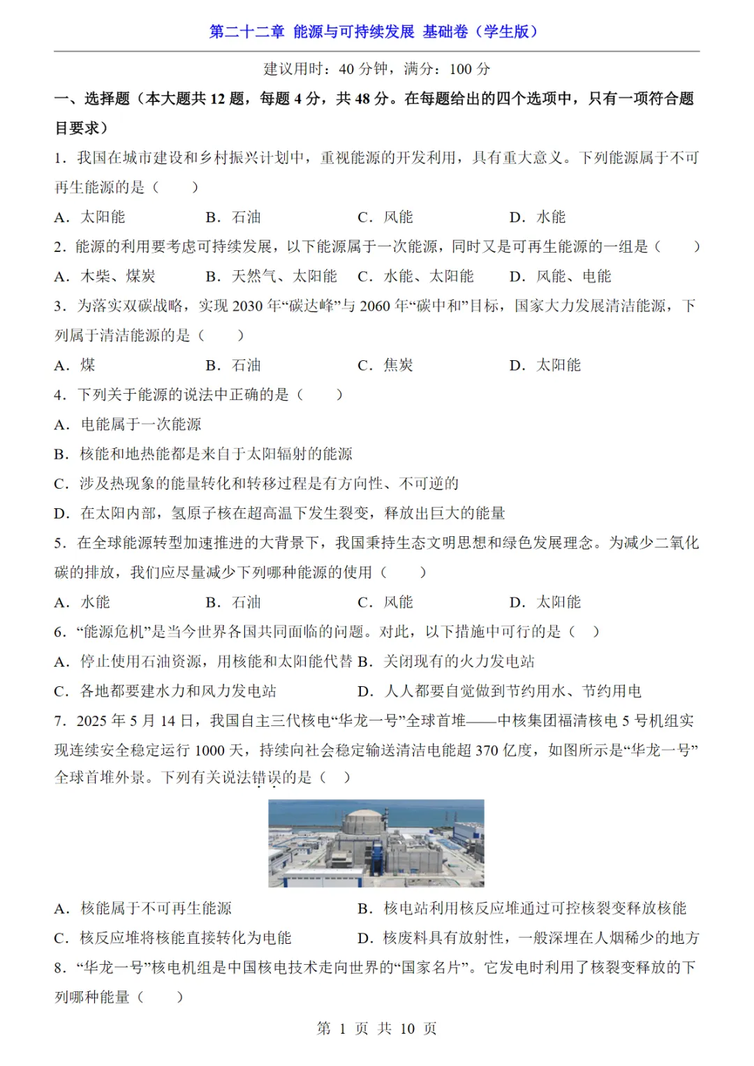 九年级(全1册)物理第22章能源与可持续发展 基础卷(人教版),PDF电子版,可下载