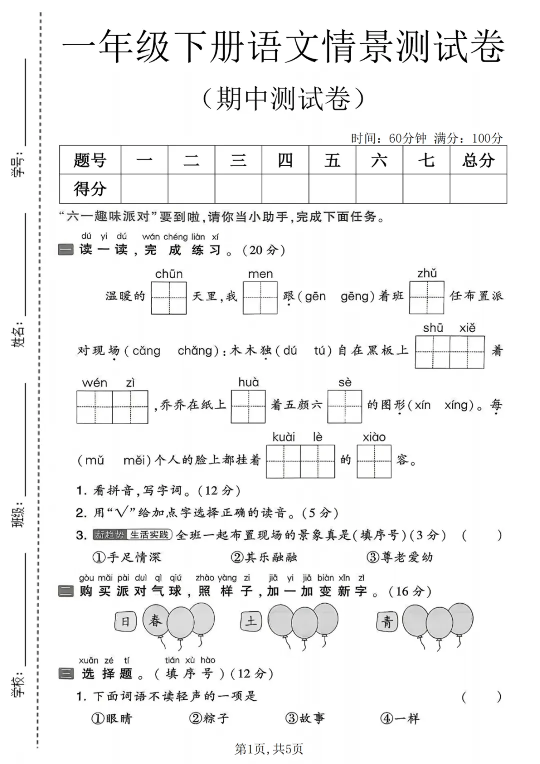 一年级(下)语文 期中情景测试卷,PDF电子版免费领取,先保存后下载,可打印