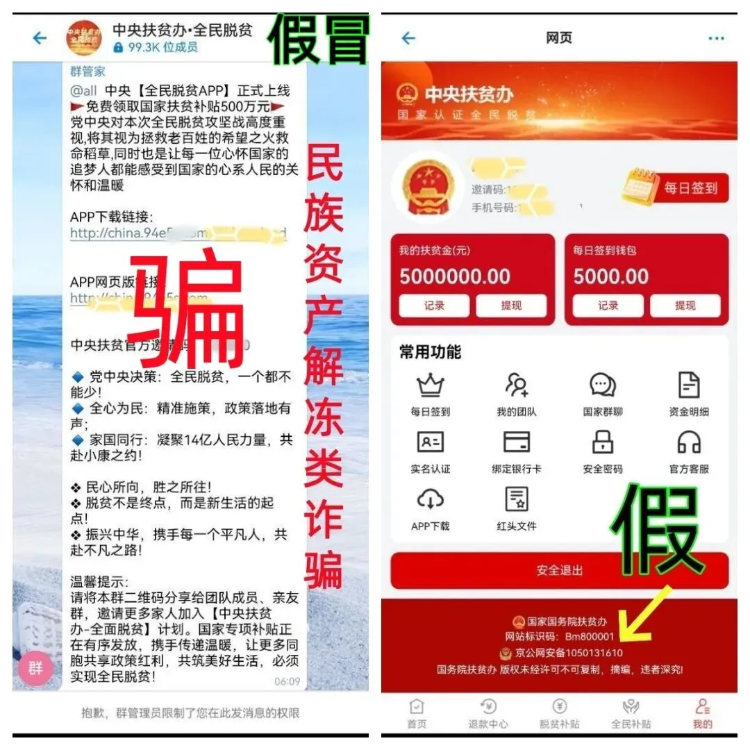 提醒:假冒官方的“中央扶贫”APP发500万元“扶贫款”是诈骗洗钱的民族资产解冻类项目!