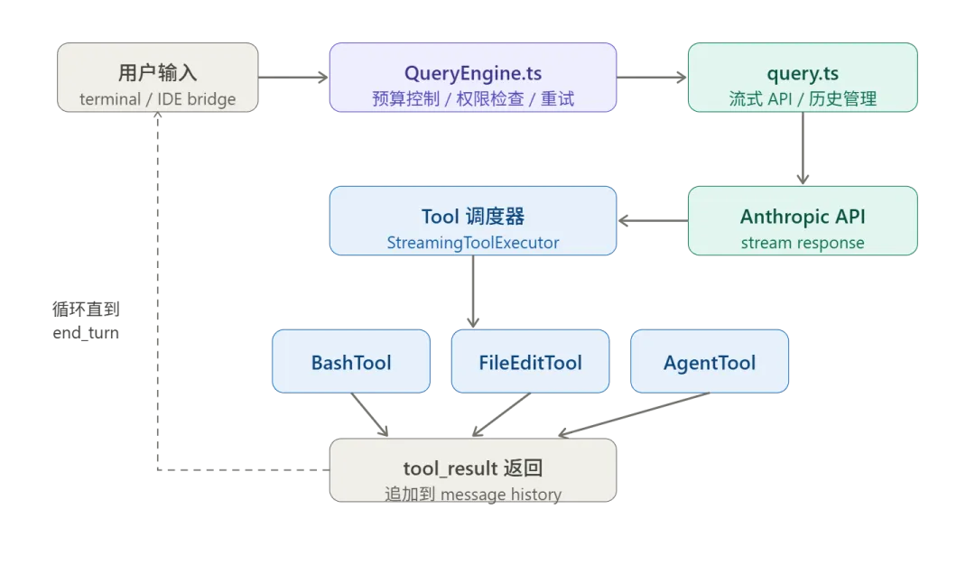 入口 main.tsx 在模块加载时并行预取系统信息(MDM、Keychain),然后通过 Commander.js 路由命令。核心循环是:用户输入 → API 调用 → 流式响应 → 执行 tool calls → 循环,直到 stop_reason=”end_turn” 或预算耗尽。两个关键文件分工很清晰:QueryEngine.ts(1295 行)是外层,负责重试、预算执行、权限检查、最大轮次限制;query.ts(1729 行)是内层,负责系统 prompt 组装、消息历史管理、API 流式调用、hook 执行、tool result 收集。