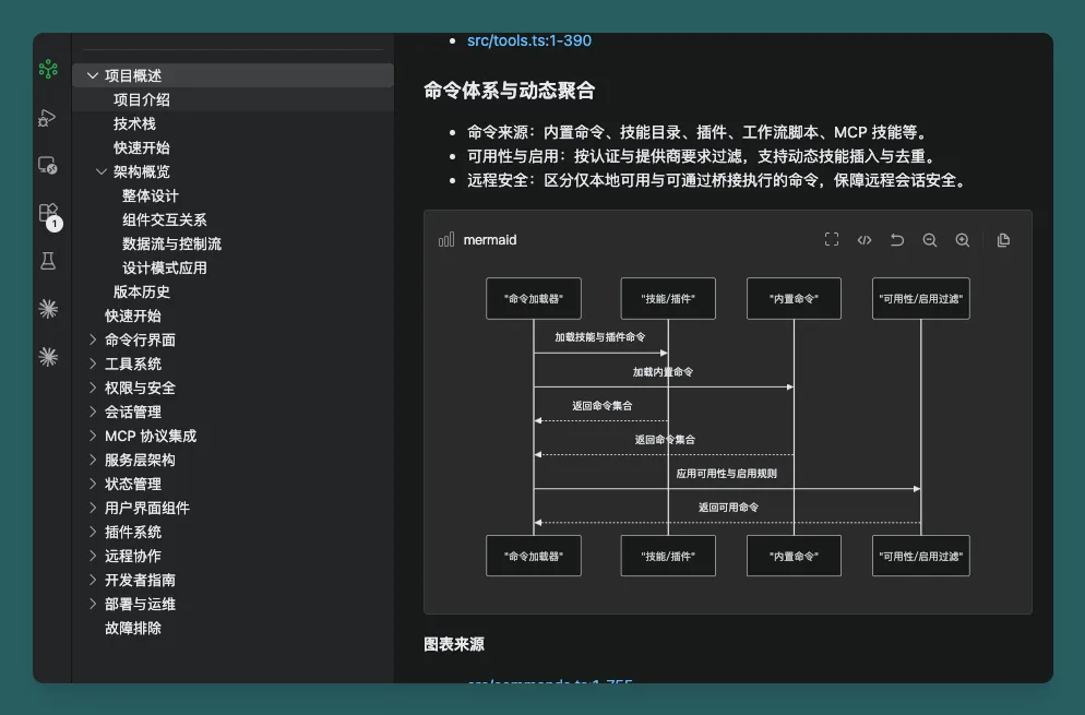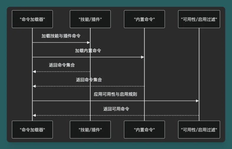 命令体系与动态聚合:命令来源覆盖内置命令、技能目录、插件、工作流脚本、MCP 技能;按认证和提供商要求过滤,并做远程安全隔离。