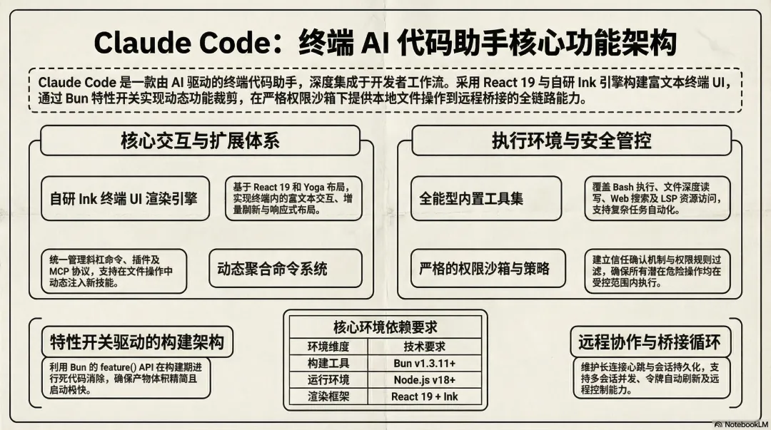 整体架构围绕“CLI 启动 → 初始化与预取 → REPL 渲染 → 工具与命令执行 → 桥接/远程控制”的主线展开,同时通过特性开关与环境变量实现灵活的功能裁剪与部署适配。